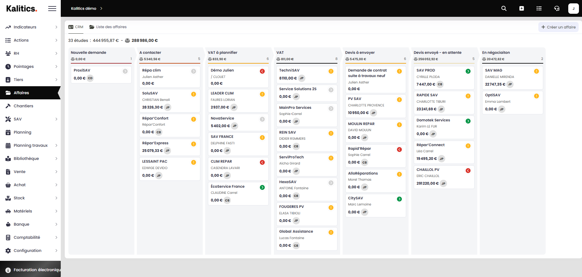 Tous vos contacts, vos affaires et vos chantiers centralisés dans un seul outil. Avec Kalitics, votre CRM et votre ERP ne font plus qu’un pour un suivi fluide et efficace.