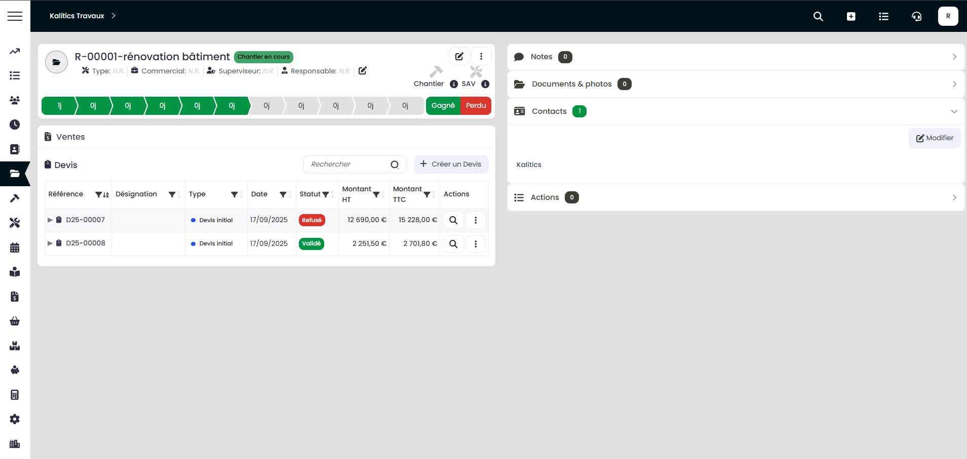 Tous vos contacts, vos affaires et vos chantiers centralisés dans un seul outil. Avec Kalitics, votre CRM et votre ERP ne font plus qu’un pour un suivi fluide et efficace.
